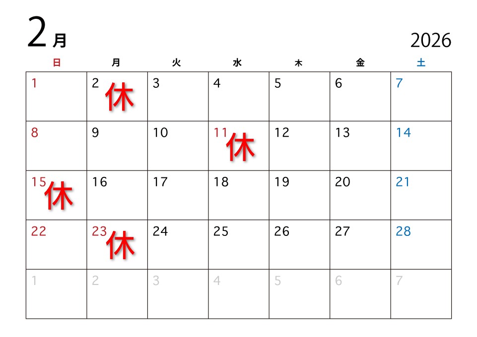 2月のお休みをお知らせ致します。